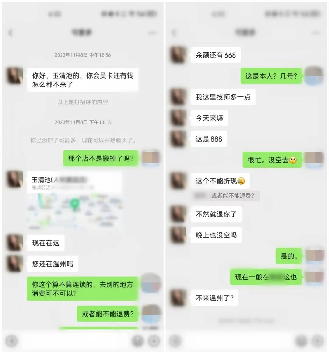 [color=rgba(0, 0, 0, 0.9)]近日,《科林维权热线》接到消费者金先生的电话,他说自己2015年在温州玉清池足浴会所办理了一张内有金额的储值卡,自己一直没有再去消费,卡里的钱却莫名其妙地被清零了,希望记者帮他维权。  [color=rgba(0, 0, 0, 0.9)]据金先生介绍,自己最后一次充值距今已有十年,是2015年在当时的玉清池六虹桥店进行的,之后就没有再消费过,直到2023年11月一位自称是玉清池工作人员的人通过微信添加了金先生,他才知道卡里余额还有668元。 金先生:在那玉清池里边充值充了好多年了,前年他们工作人员还联系我说我里面有多少钱...今年正月的时候,然后我打电话给他们,他们说他们跟原来我充值的店不是连锁店关系了,然后说已经公告了什么的,然后不承认这笔钱。  [color=rgba(0, 0, 0, 0.9)]金先生告诉记者他也和玉清池总部的工作人员联系过,但对方表示自己充值的店已经不是玉清池的连锁店,没办法为金先生办理退款。 金先生:我是在六虹桥这边充的,他们这边不是很早以前就拆迁了,拆迁了之后,然后他说在那边已经公告公示过了,我说你又没有通知到我,他说这是他们那边的事情。  [color=rgba(0, 0, 0, 0.9)]科林维权记者通过金先生提供的微信聊天记录等材料看到,基本上是金先生和自称玉清池工作人员个人之间的谈话截图,并没有当时的交款凭证付款记录等信息,考虑上次充值消费距今已经将近10年,期间可能存在很多变量,主持人在直播节目中连线玉清池,对方表示会先查询下具体情况。 玉清池工作人员:我这个电话是总公司的电话,你把这个电话号码发过来给我,我帮他查一下好吧? [color=rgba(0, 0, 0, 0.9)] 对于核查结果,发稿前,记者和投诉人都未得到玉清池的明确回复。  对于此类消费,中国消费者协会提醒消费者要注意以下几点: 1.谨慎办理预付卡、储值卡。消费者要确认自己是否真的长期需要此类服务,不要贪图一时的高折扣或者轻信商家的销售话术。当前预付式消费纠纷追回损失非常困难,所以消费者应谨慎采用预付式方式进行消费,尽量不办预付卡。